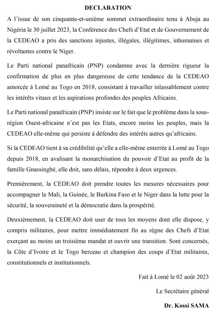 Le Parti national panafricain (PNP) réagit