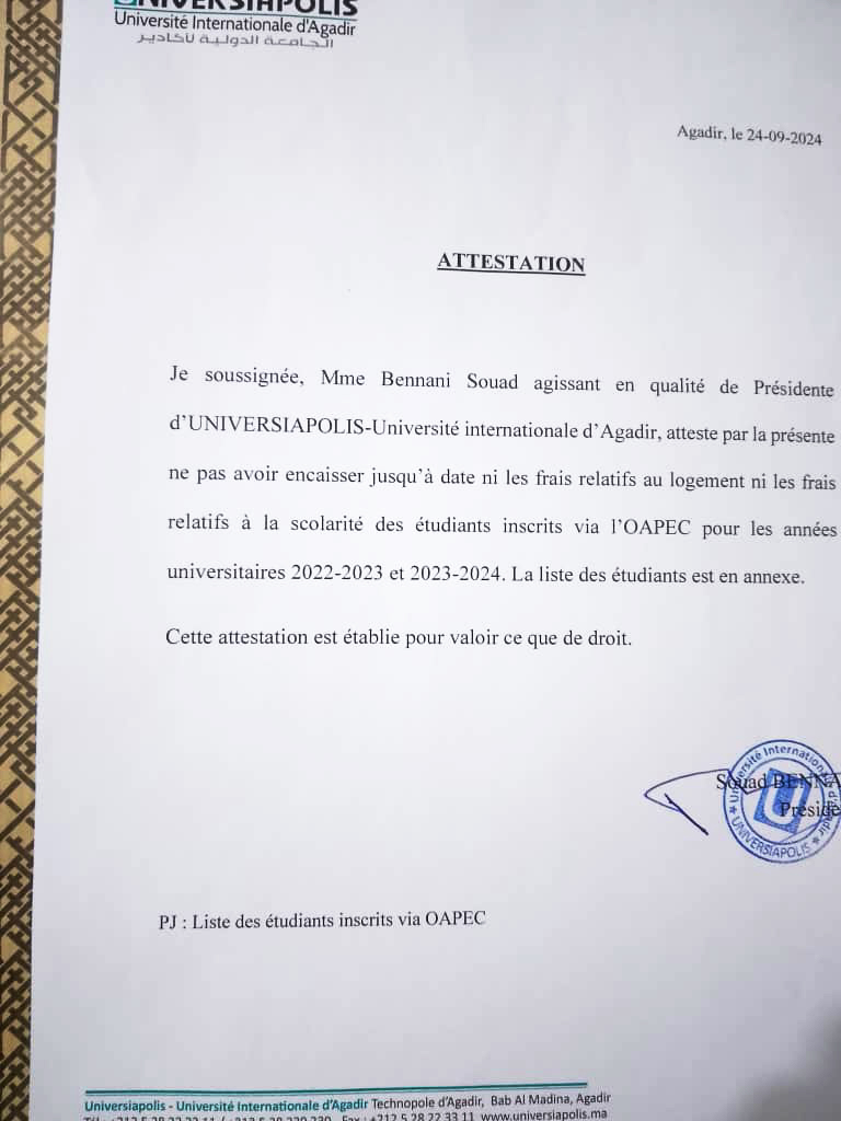 Nous remercions Mr FIANYO Kokou, Membre du conseil d’administration de l’Oapec, Organisation Africaine pour l’Education et la Culture, pour avoir pris soins de nous définir le mot « Escroquerie » au début de son droit de réponse qui a présenté l’Oapec et son patron TETE S., comme des saints dans leur mode de fonctionnement.  Parallèlement à ce document que nous avions publié pour l’Ong l’Oapec, nous avions des documents, des témoignages vivants et le contenu partiel d’un compte rendu de réunion au siège de de l’Ong.  Nous vous en publions pour le moment, une petite partie. En fin d’année l’université UNIVERSIAPOLIS-Université internationale d’Agadir au Maroc, affiche la liste des 78 élèves inscrits dans cette université par le truchement de l’OAPEC les informant que depuis deux leur inscription l’OAPEC qui les a inscrit n’a pas payer ni leurs loyers ni leurs frais de scolarité.  Chaque étudiant en informe ses parents qui rentrent en contact avec l’ONG à Lomé.