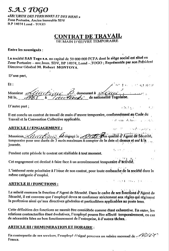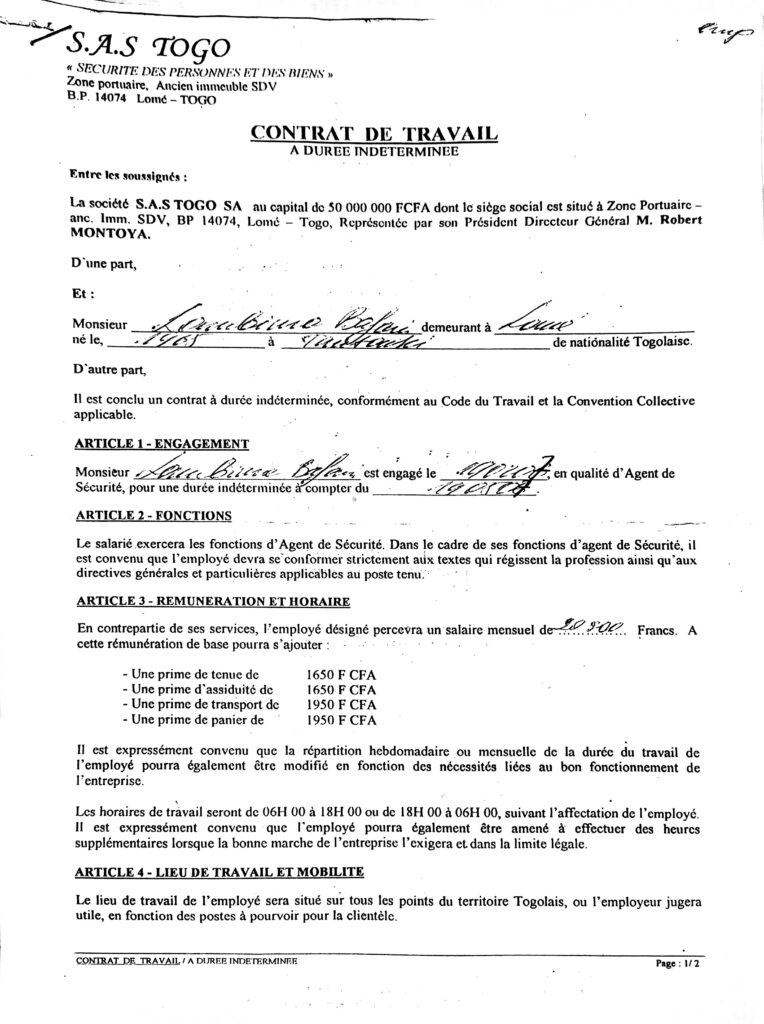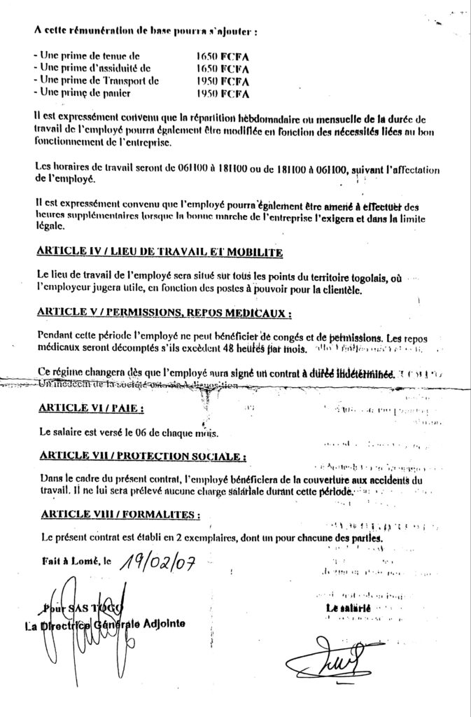 Le jugement dit que les employés de SAS n’ont pas apporté la preuve qu’ils sont employés à SAS. Et c’est précisément l’absence du contrat de travail qui a obligé le premier avocat à transmettre le dossier à celui de qui il l’avait reçu. Et pourtant, les employés avaient belle et bien remis les contrats de travail à durée indéterminée que nous vous publions ici. Pourquoi celui qui a reçu les dossiers des agents a-t-il soustrait les contrats de travail des dossiers ? Y a-t-il mieux qu’un contrat CDI pour quelqu’un qui veut prouver son employabilité avec son patron? Cette situation d’injustice a démoli la moitié des employés, mais au moins la seconde moitié est vivante, on peut les interroger plutôt que de les faire écouter des discours du genre, ils n’ont qu’à considérer qu’ on peut faire un enfant qui meurt au bout de son parcours académique alors que le parent n’a tiré aucun profit.