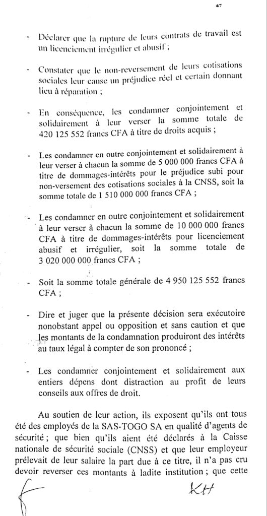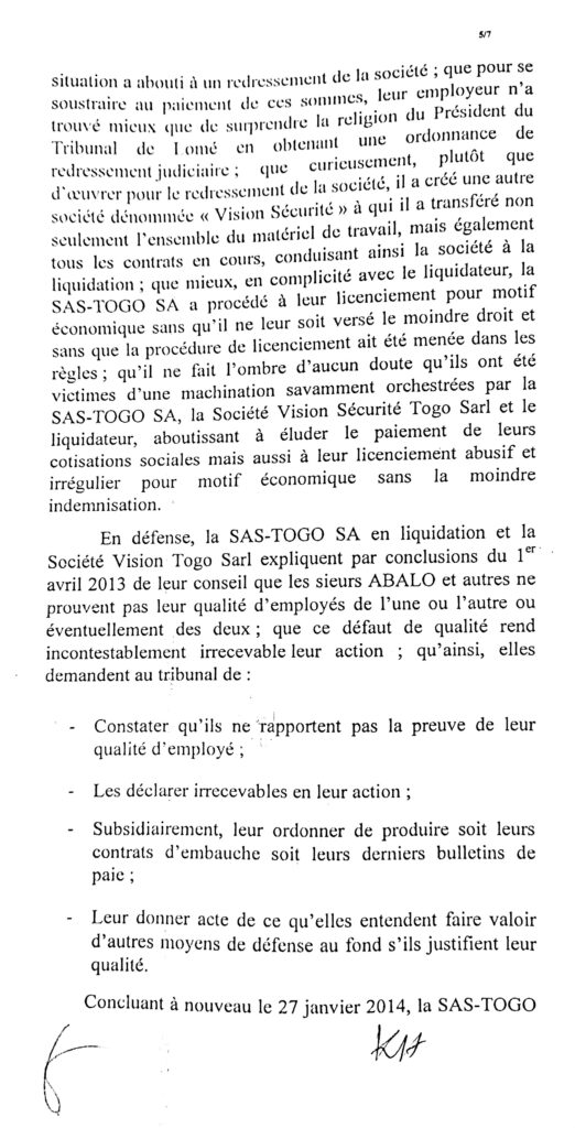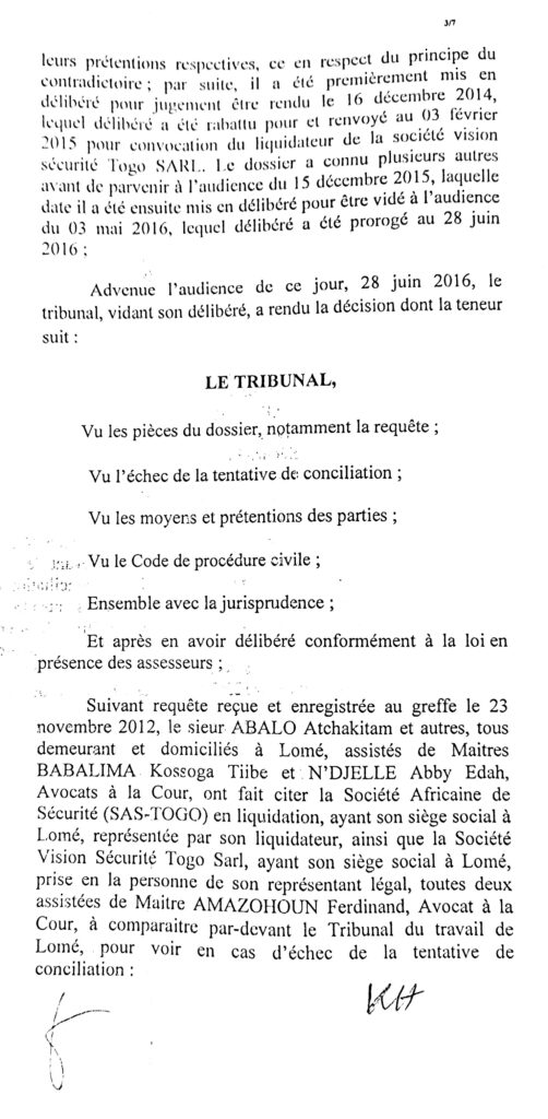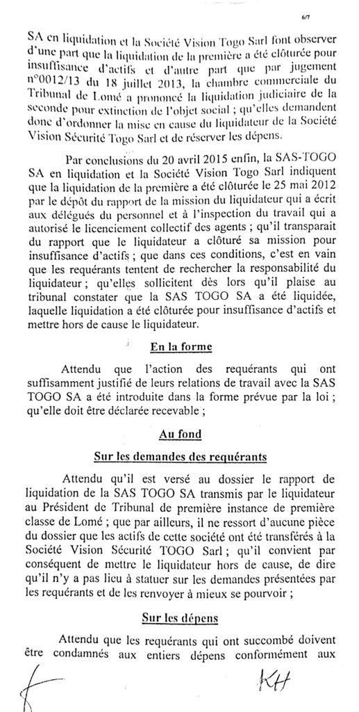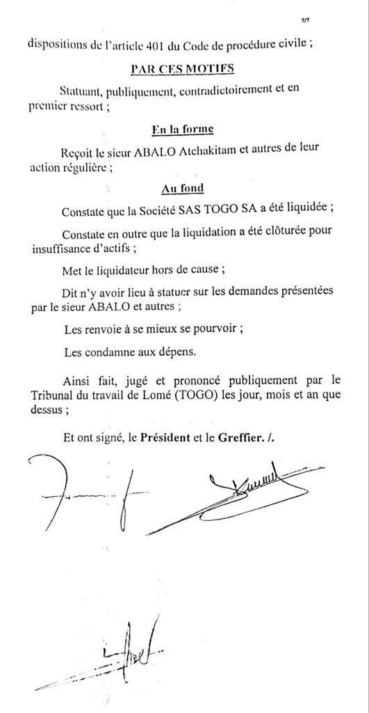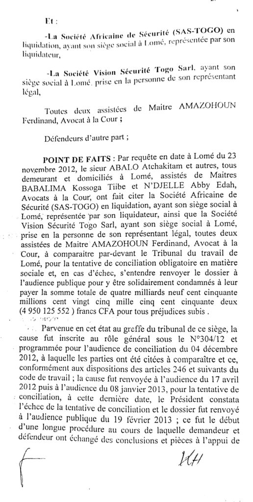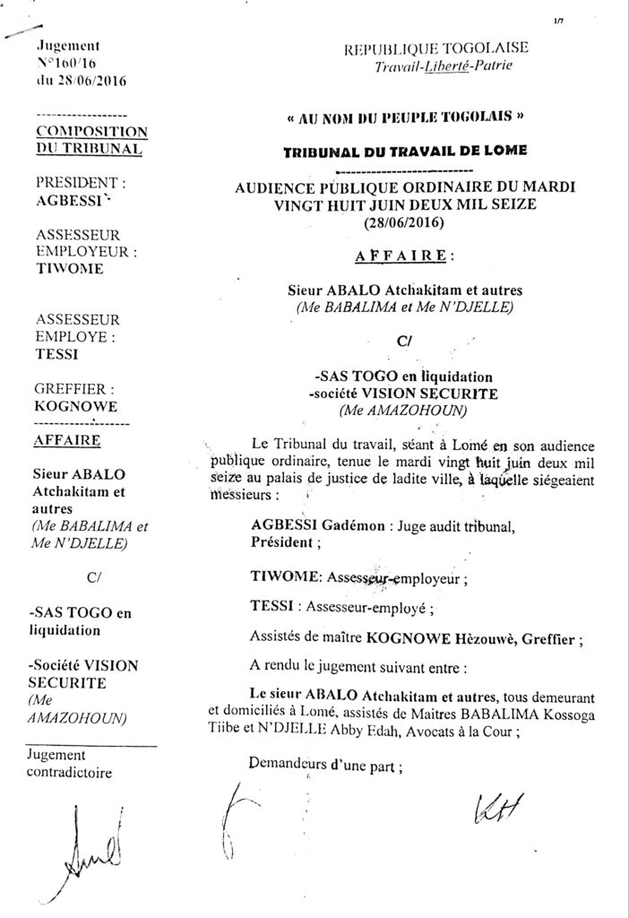 Que l’inspection nous aide à comprendre cette affaire, que le barreau joue son rôle et que les victimes des jeux de passepasse d’une race d’avocats soient dédommager. Le chef de l’Etat doit ouvrir l’œil sans quoi le cancer atteint la moelle. Allant du président du tribunal AGBESSI, au greffier de l’époque KOGNOWOE et les autres acteurs, que chacun dise sa part de vérité. Entre le juge et l’avocat qui a extirpé du dossier le contrat du travail des agents?
